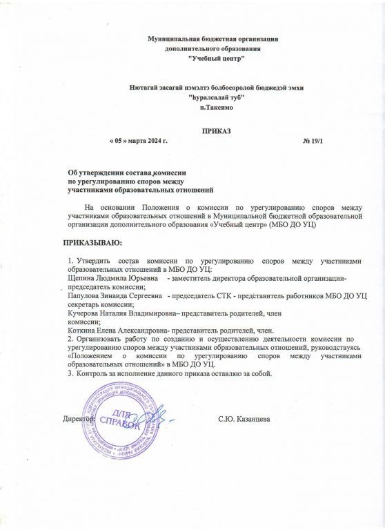 Приказ об утверждении состава комиссии по урегулированию споров между участниками образовательных отношений (скачать) (посмотреть)